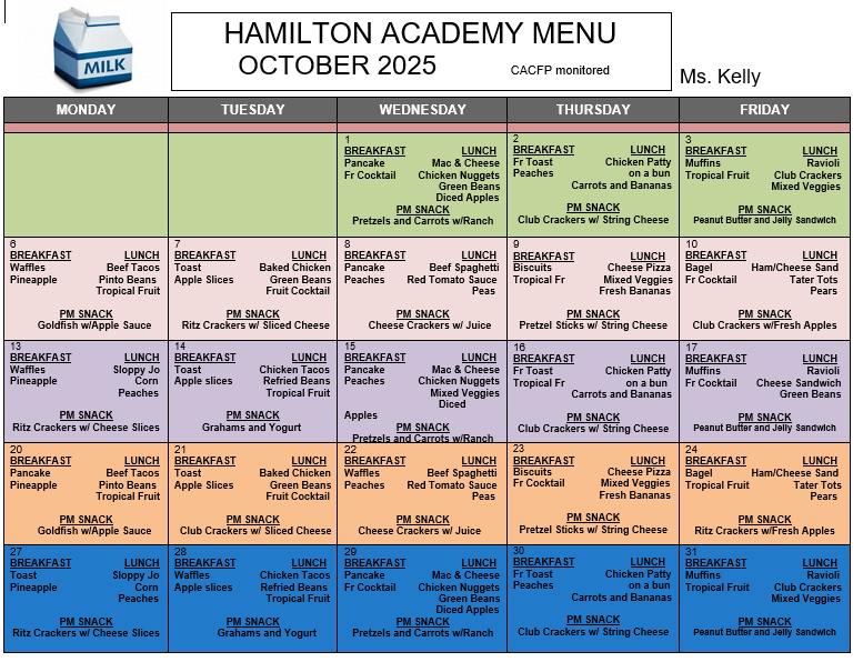 Menu Calendar Approx. Breakfast 9am Lunch 11:30am Snack 3pm